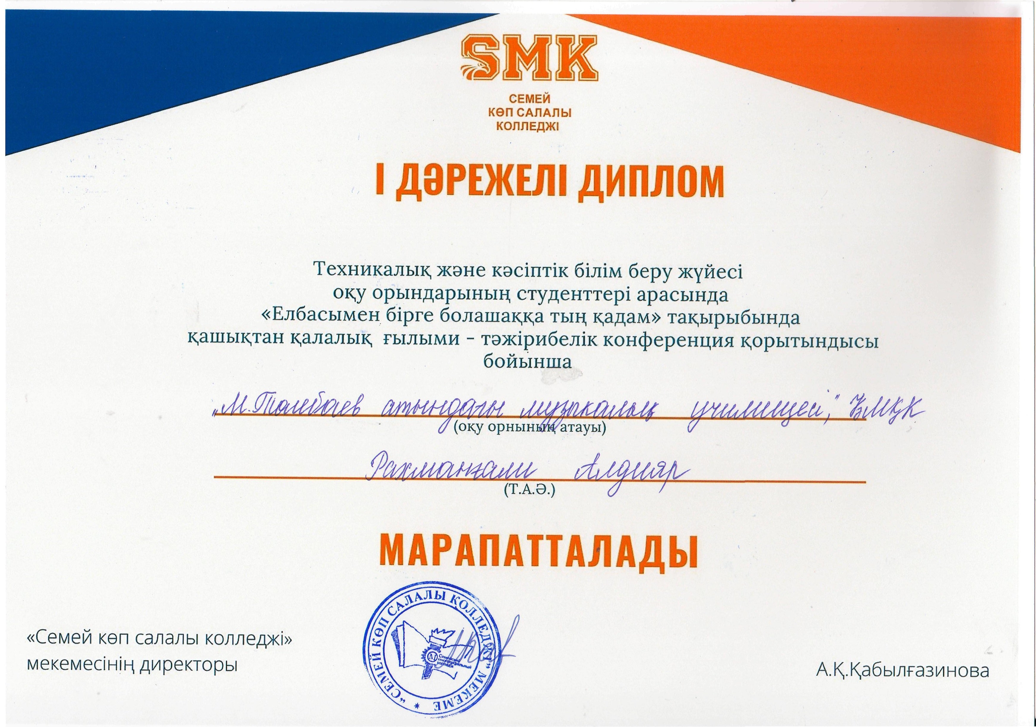 Техникалық және кәсіптік білім беру жуйесі оқу орындарының студенттері арасында «Елбасымен бірге болашаққа тың қадам» тақырыбындағы қашықтан қалалық ғылыми-тәжірибелік конференция жеңімпаздарын құттықтаймыз. Рахманғали Алдияр «ән бөлімі» 2 курс. Ғылыми жетекшісі:Рахимжанова А.Ш.